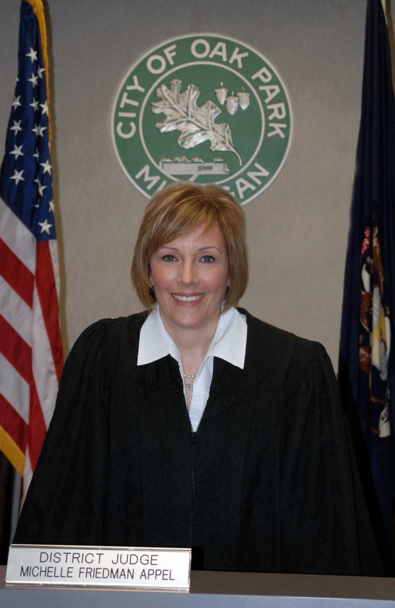 |  | HONORABLE MICHELLE FRIEDMAN APPEL, Chief Judge, took the bench in 2003 and was re-elected in 2008. Judge Friedman Appel is a graduate of the University of Michigan and the University of Detroit Law School and was admitted to the State Bar of Michigan in 1981. She was a practicing attorney for over 20 years, regularly appearing in the Circuit and Probate Courts in Wayne, Oakland, Macomb and Livingston Counties. Prior to her election to the bench, from 1999-2002 Judge Friedman Appel also served as an Oakland County Commissioner representing Oak Park, Huntington Woods, and Pleasant Ridge. Currently Judge Friedman Appel is a member of and is past president of Oakland County District Judges Association, she serves on the Board of Directors Oak Park Business Education Alliance, is a Junior Achievement Volunteer for Oak Park School District, she participates with the Tri-Community Coalition, the drug prevention coalition serving the cities of Oak Park, Huntington Woods and Berkley, is a member of the Michigan District Judges Association Legislative and Judicial Response Committee, and maintains a membership in NAACP, South Oakland Chapter and the Oak Park/ROT Optimist Club. Included in the programs that have been established at the 45th District Court, since her election, is the Domestic Violence Court, the Volunteer Probation Officers Program, the Teen Court Program that is run in partnership with the school districts and the Oakland County Prosecutor's office and the University of Detroit Mercy Law School. |